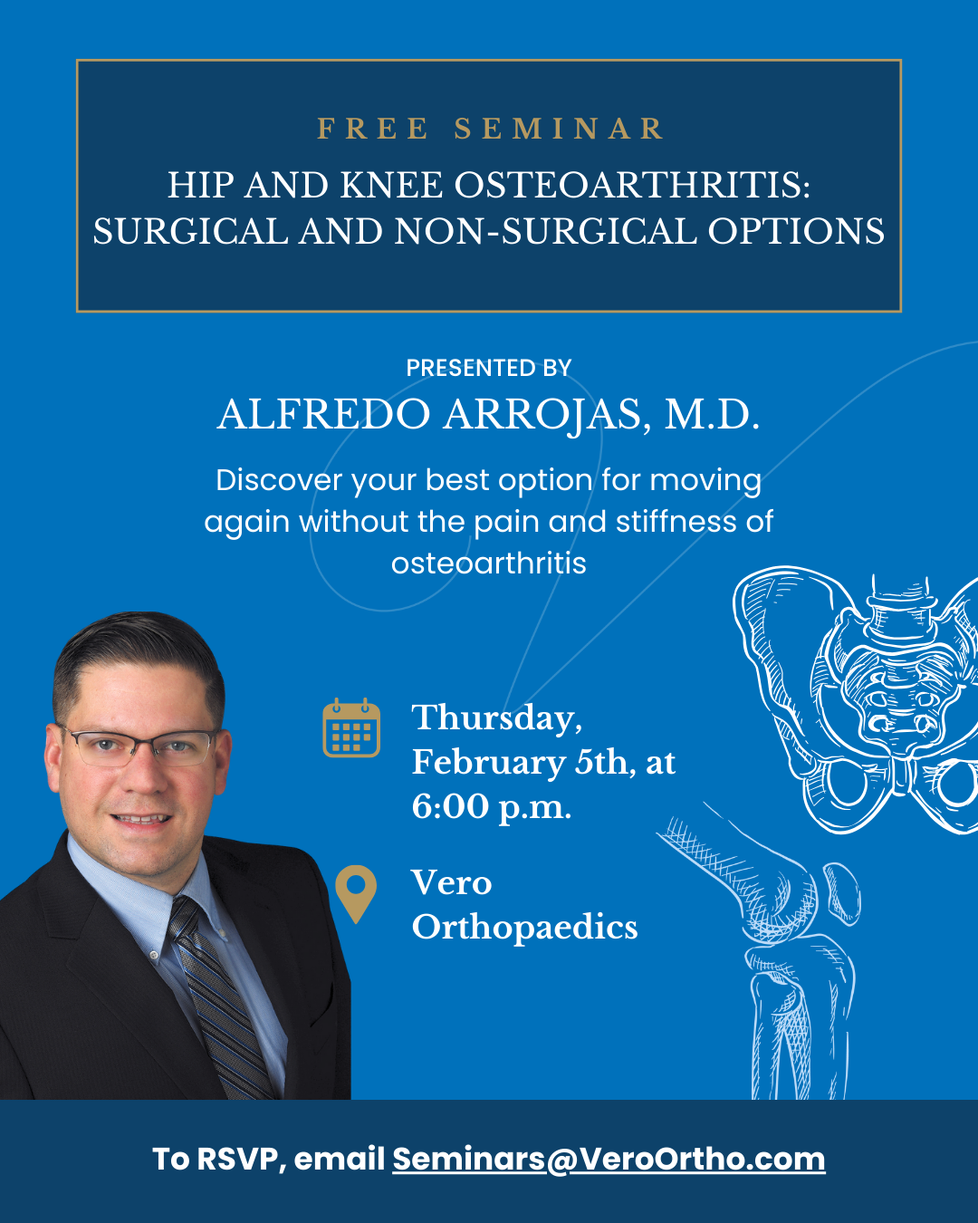 At Vero Orthopaedics, we believe that informed patients make the best decisions for their health. We invite you to join us for a free educational seminar on the latest treatments for hip and knee osteoarthritis, led by Alfredo Arrojas, M.D., a board-certified orthopaedic surgeon specializing in joint replacement and robotic surgery.